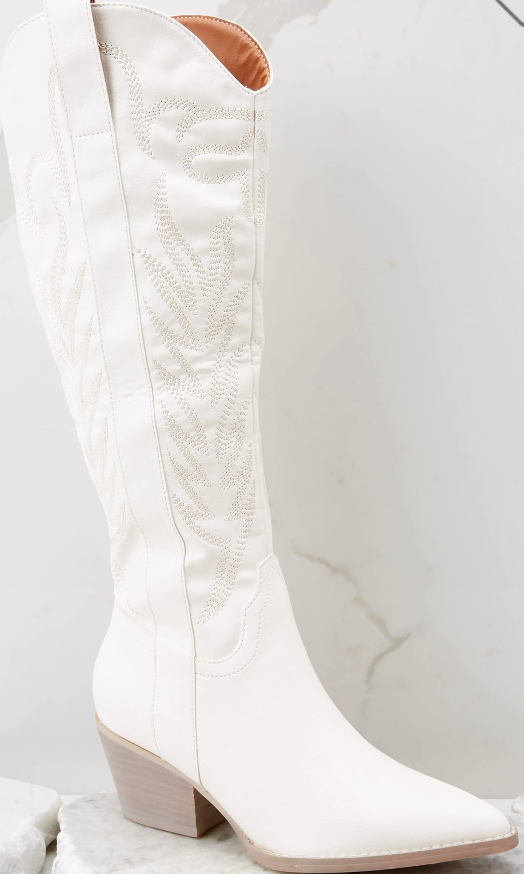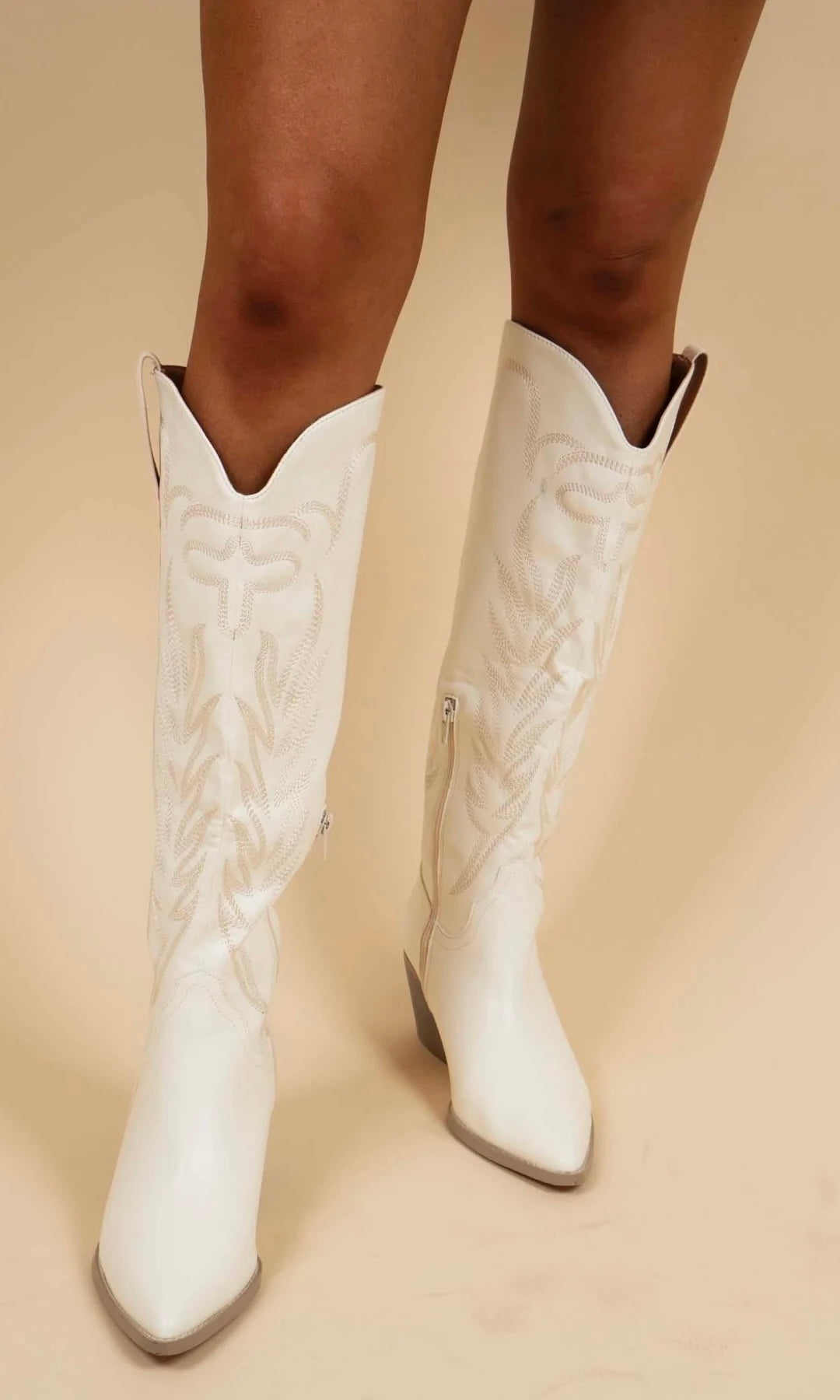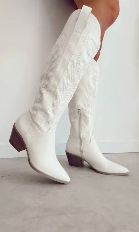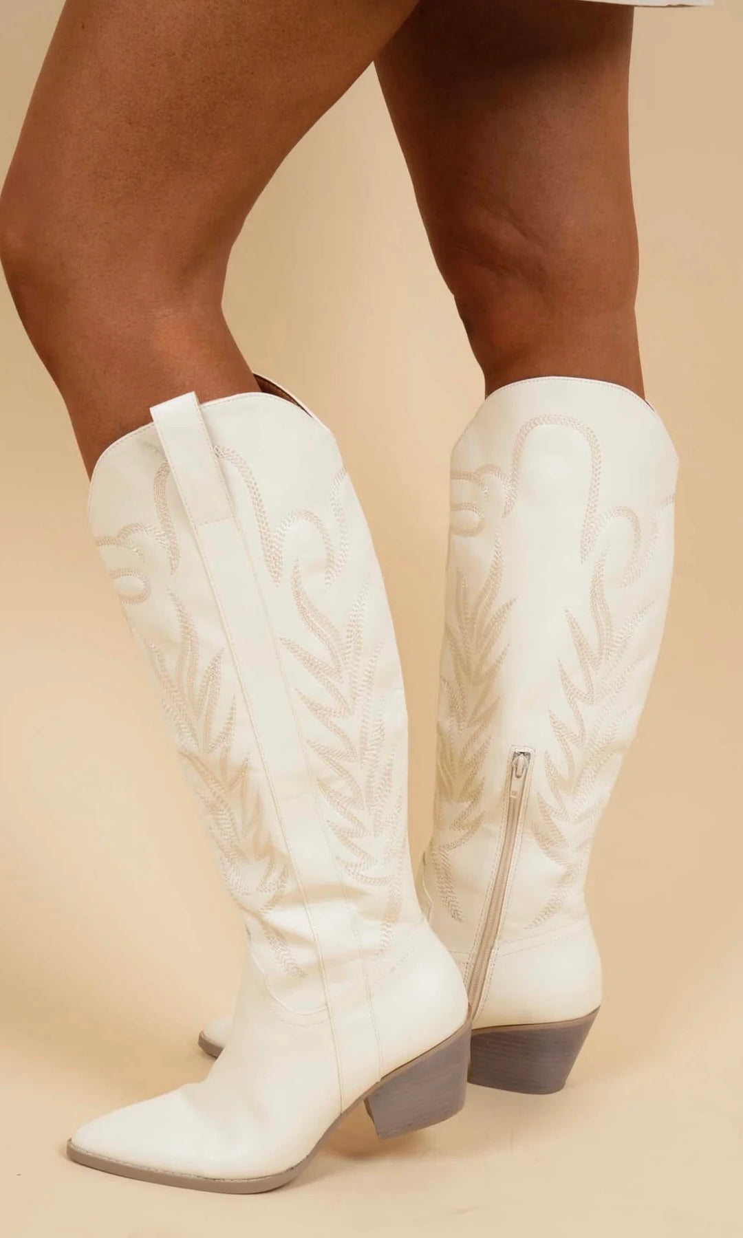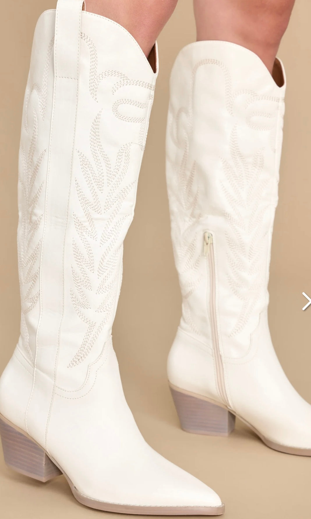 -WESTERN BOOTS Intricate embroidery gives this boot an eye-catching look -SHOE MODEL SUGGESTION: RUNS SMALL - MODEL PREFERS 1/2 SIZE LARGER -ALL MEASUREMENTS ARE MADE ON A SIZE 7.5. THERE MAY BE SLIGHT MEASUREMENT VARIATIONS BASED ON SIZE. Upper Material: Man-made Upper Insole Material: Padded Insole Sole or Heel Material: Leather wrap heel Shaft Height: 13.75\" Heel Height: 2.5\" The front platform: 0.25\" Types of closures: zipper Circumference of shoe opening: 15\" Bottom of the sole: 5\" COLOR:WHITE,TAN,NUDE,BLACK