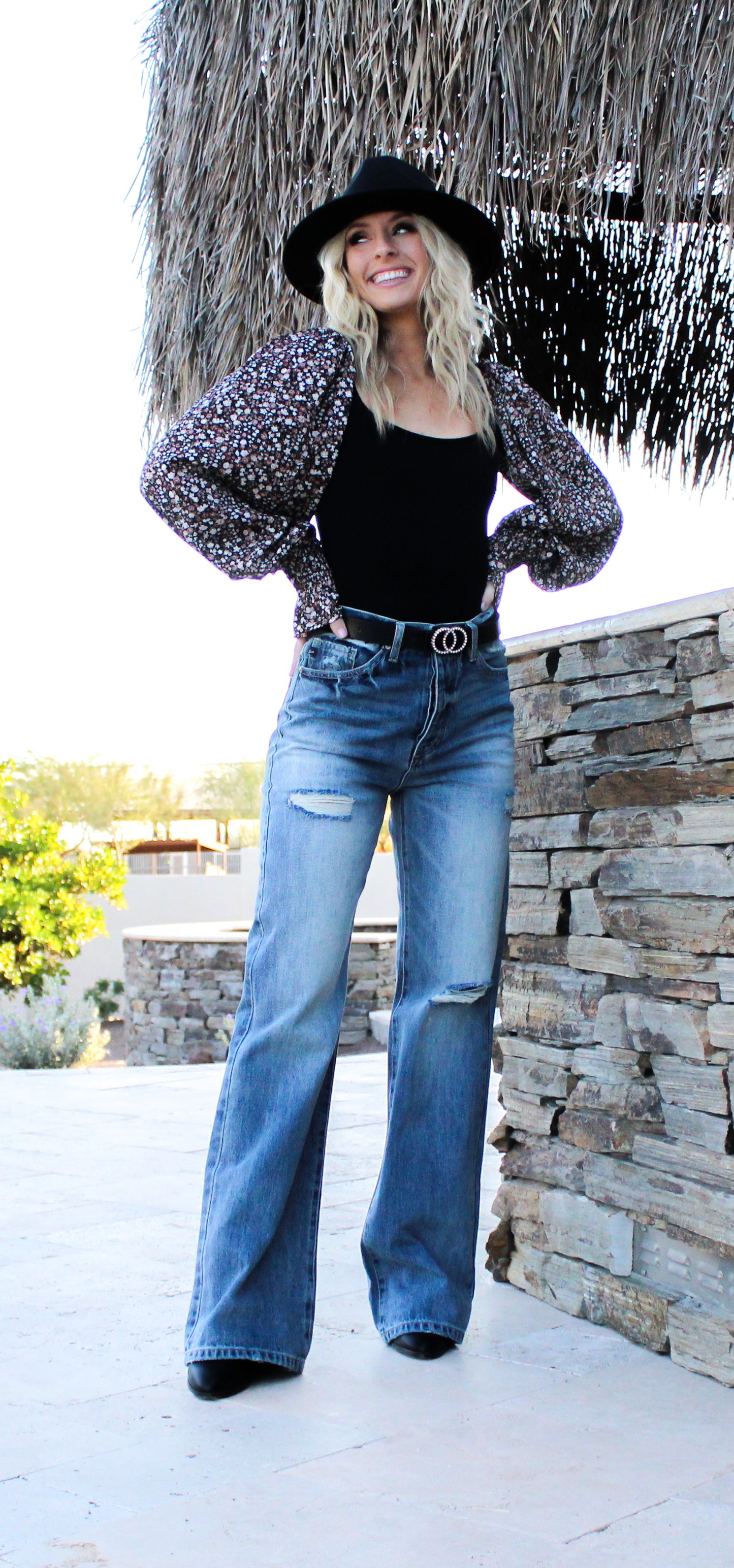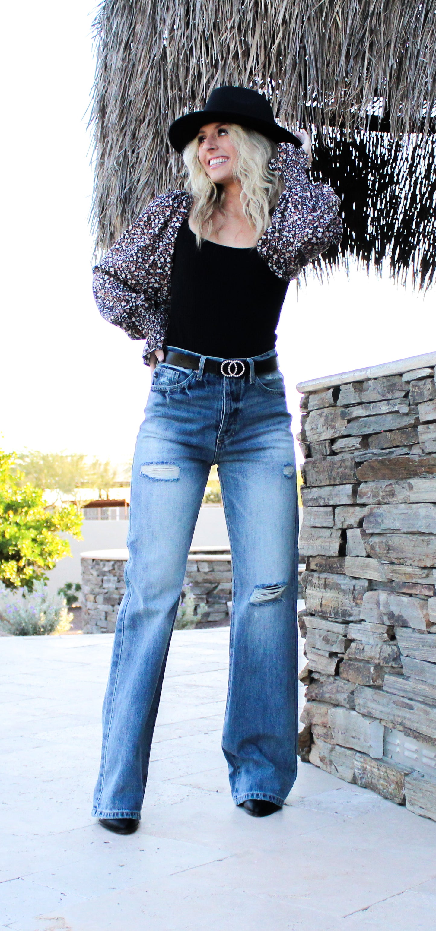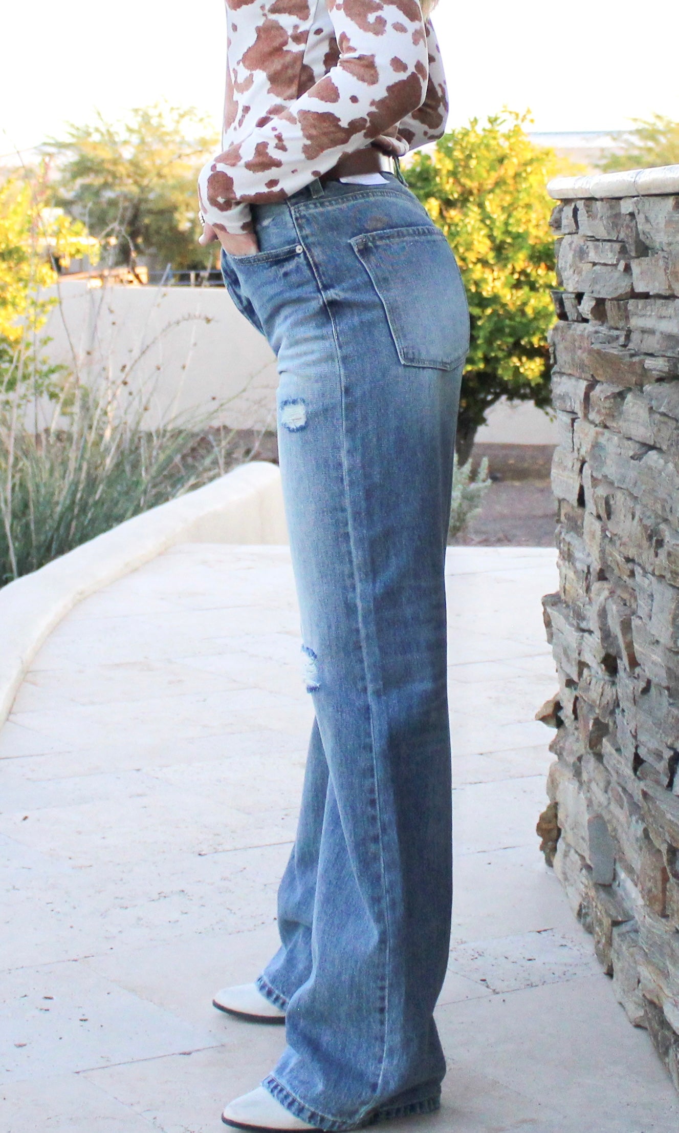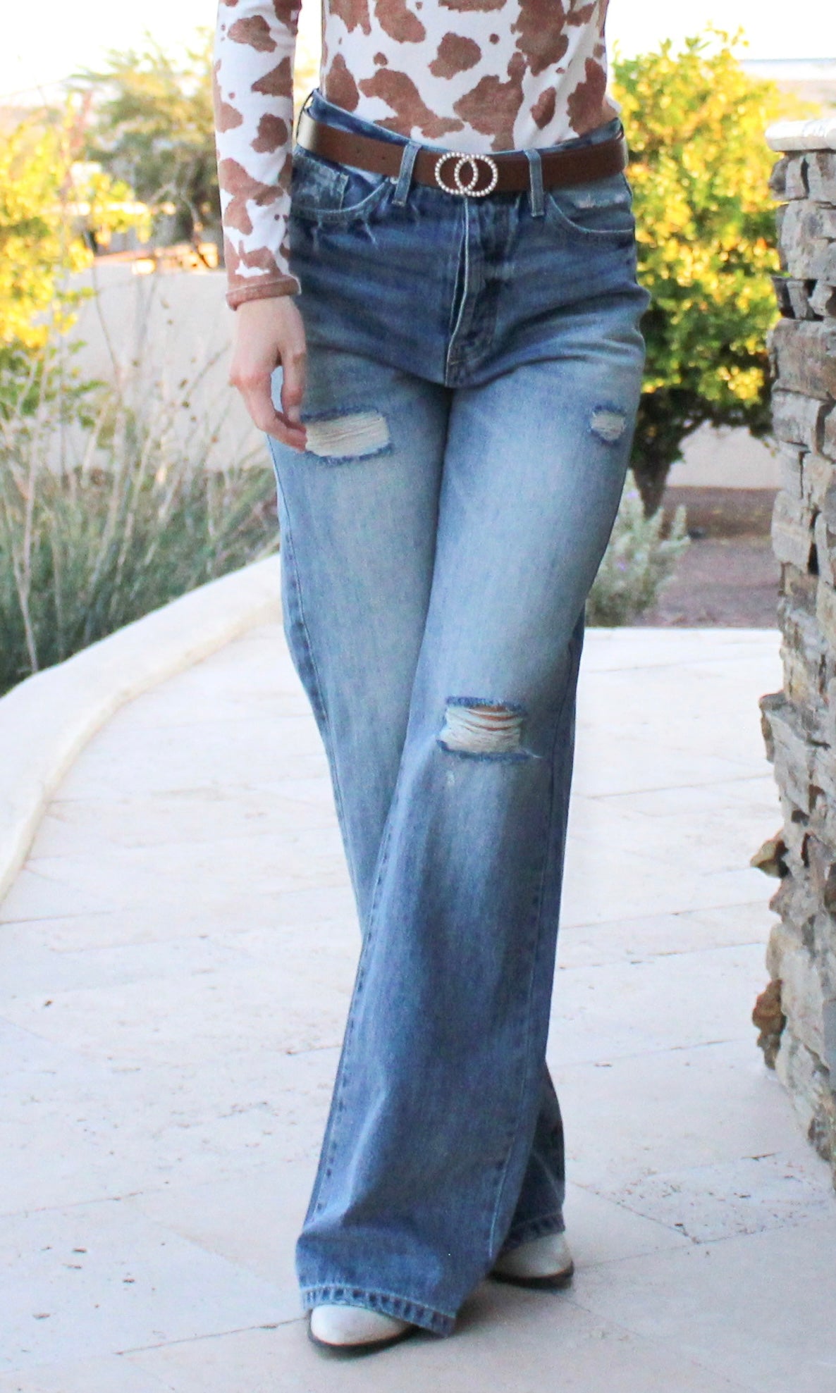 - ⭐️Best Seller⭐️ It’s a vibe! Our High Rise Distressed 90’s Flare Denim features true denim, medium wash, no stretch or fading, classic 5 pockets and front button fly closures.