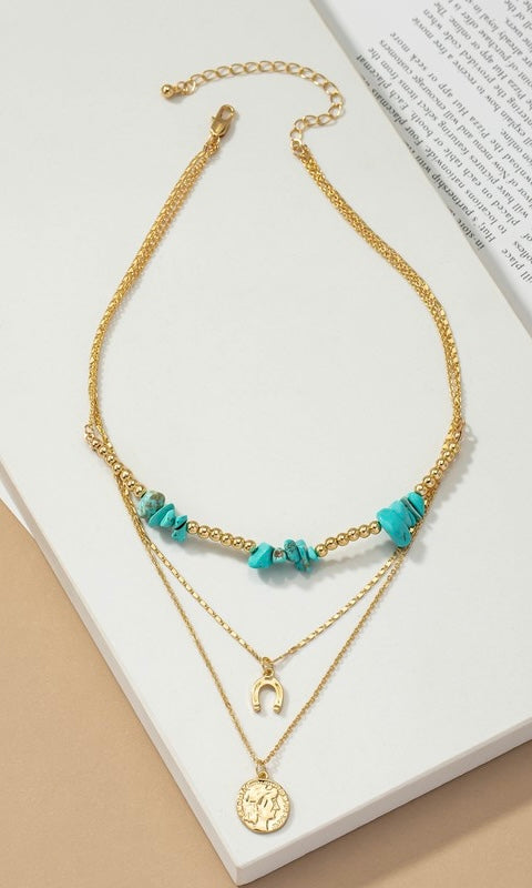 Three row choker chain necklace with turquoise stone chips, horseshoe and coin pendants. Made of brass chain, natural stones, and alloy pendants. Shiny gold plating.