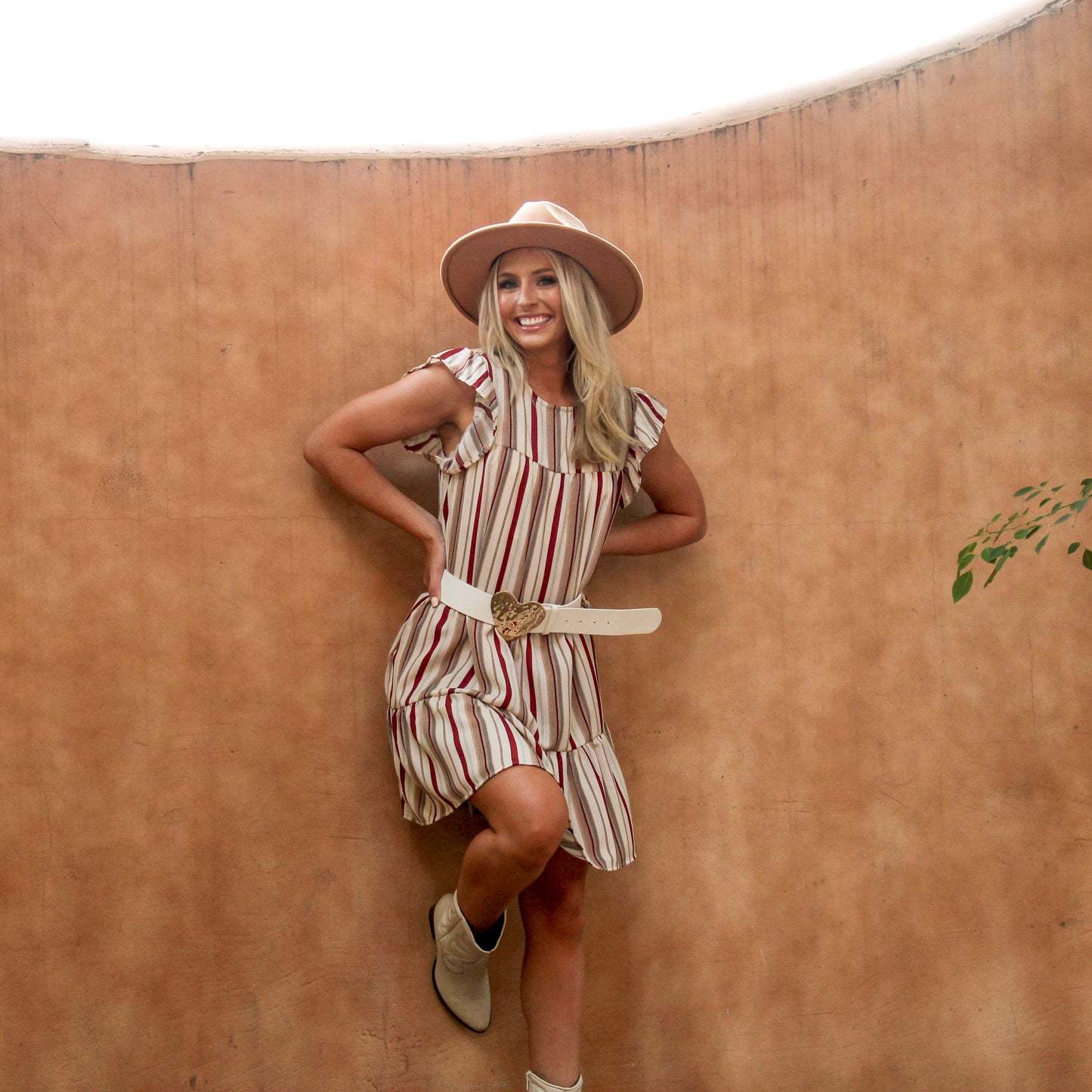 Short Sleeve Stripe Woven Gathered Multi Tier Mini Dress with Pockets, & Fluttered Sleeves