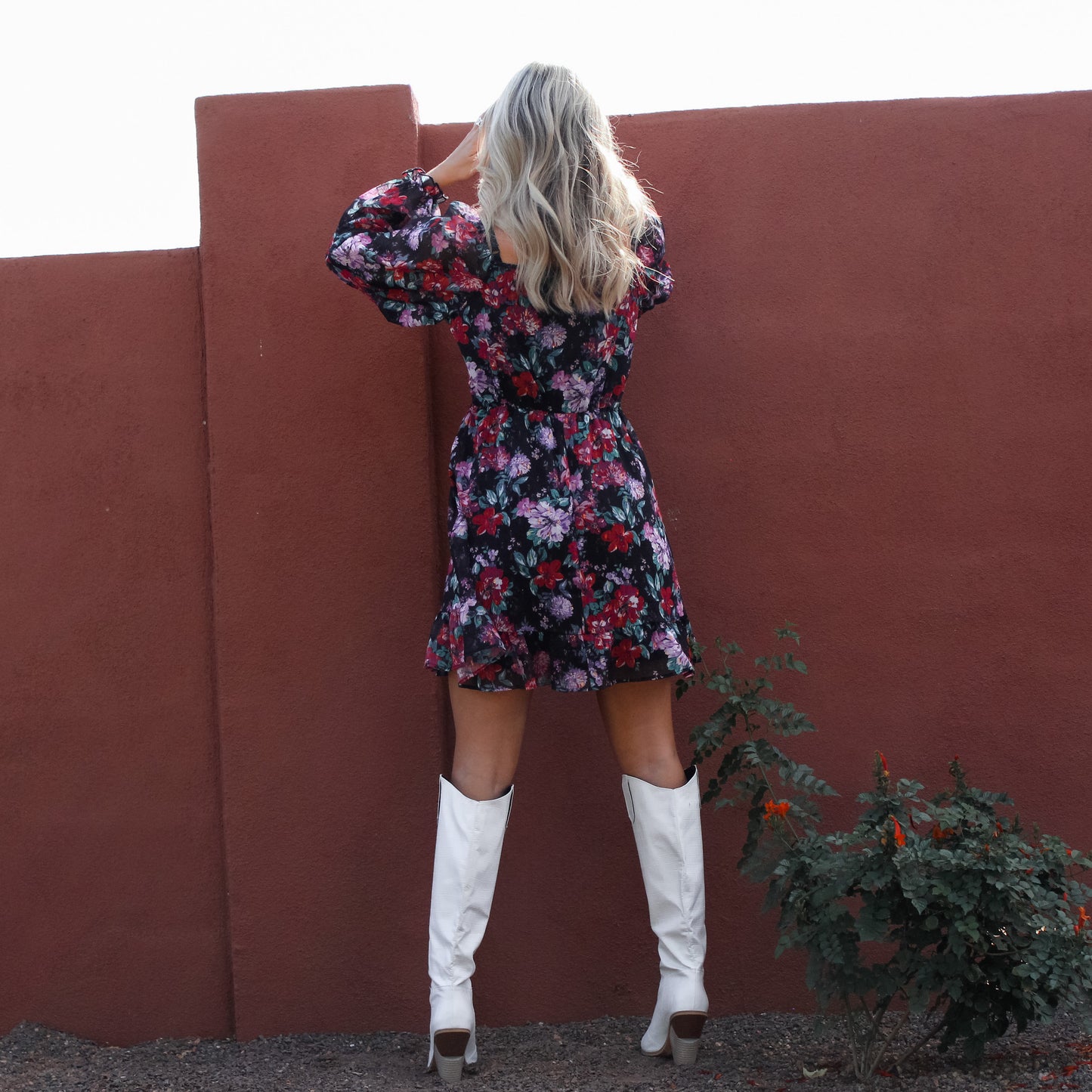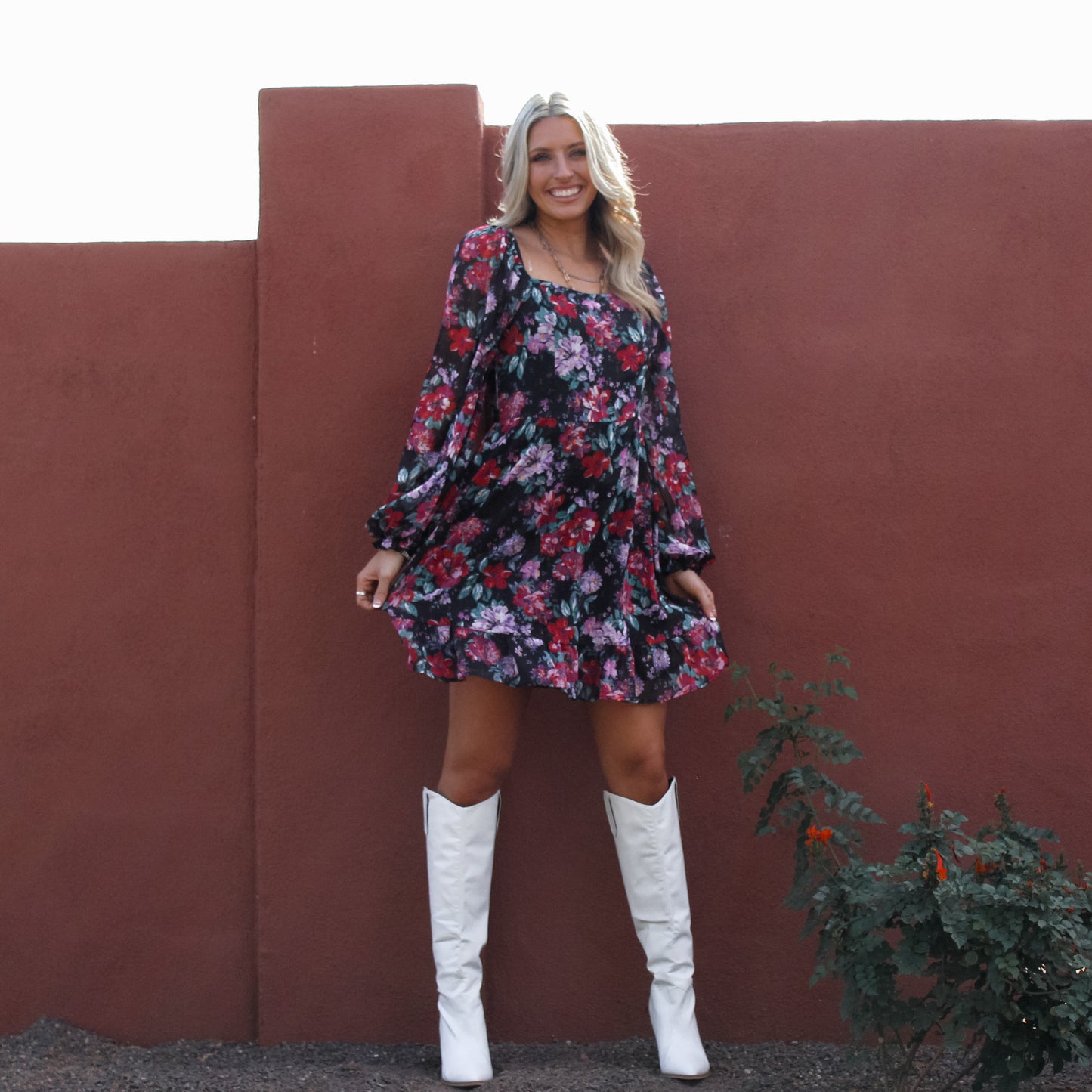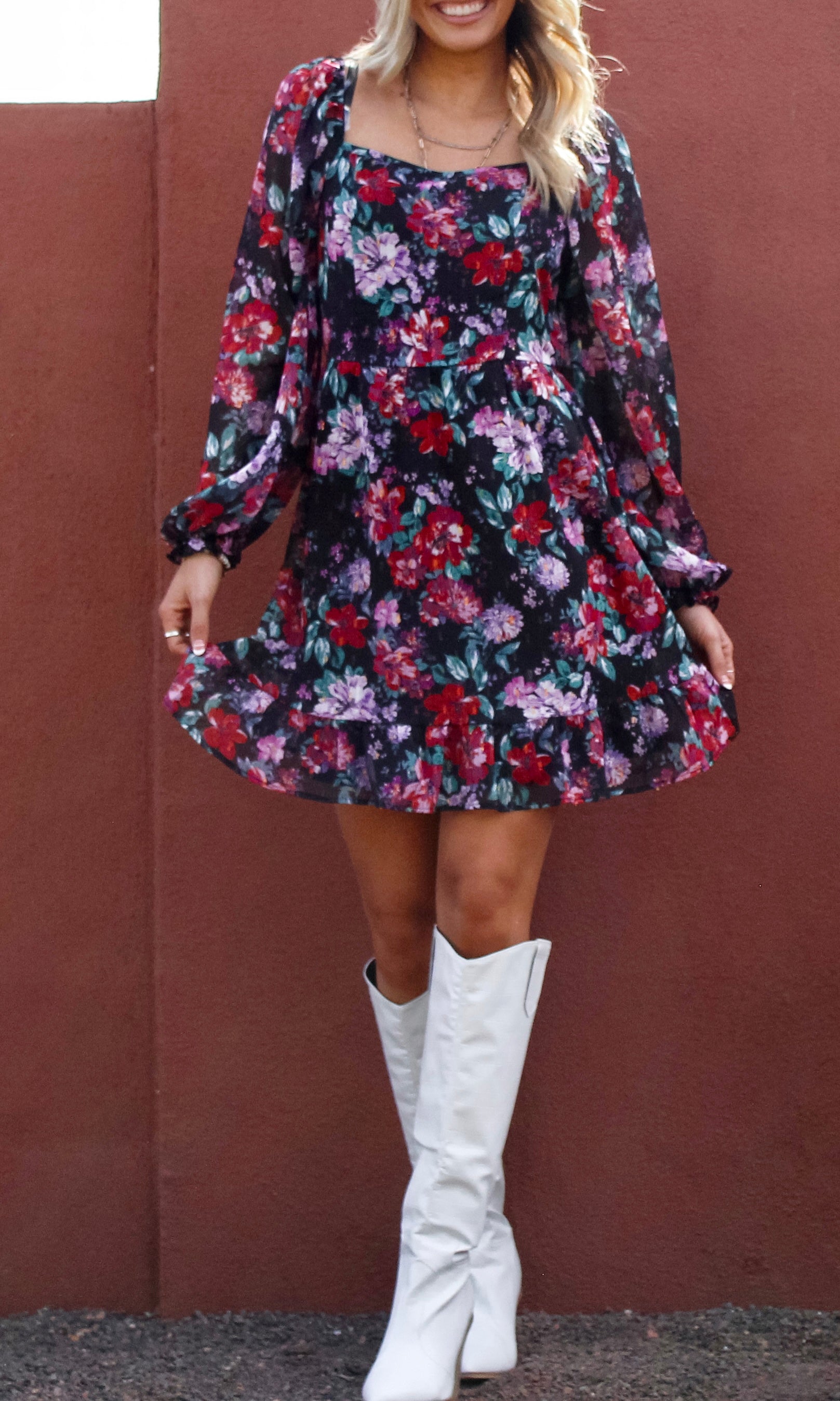 Bold Floral Print Square Elastic Neck LS Mini Dress -