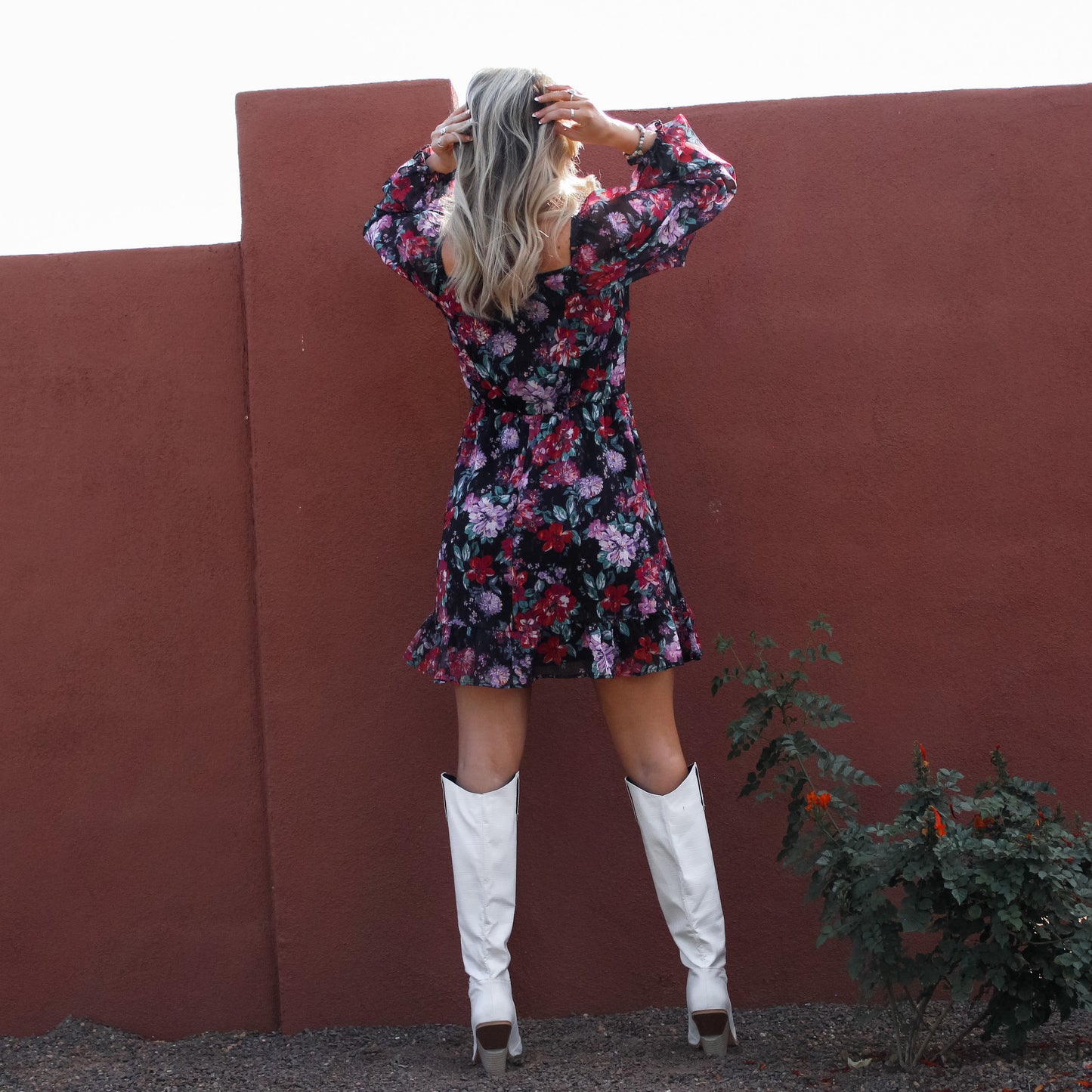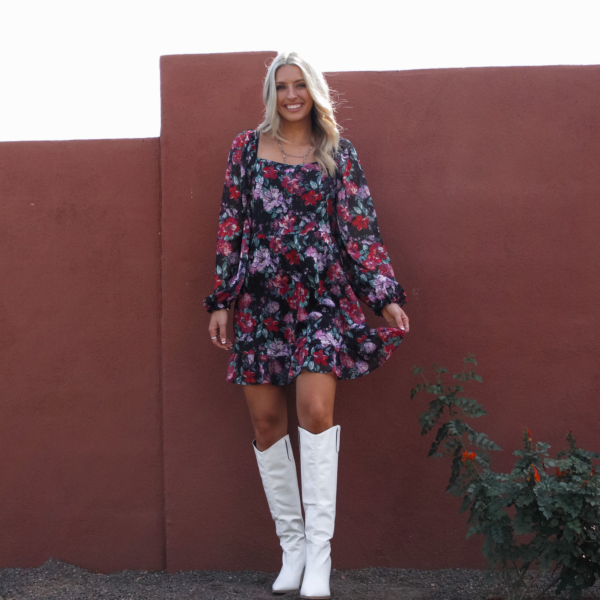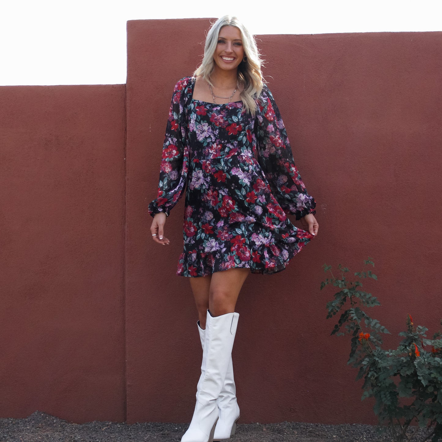 Bold Floral Print Square Elastic Neck LS Mini Dress -