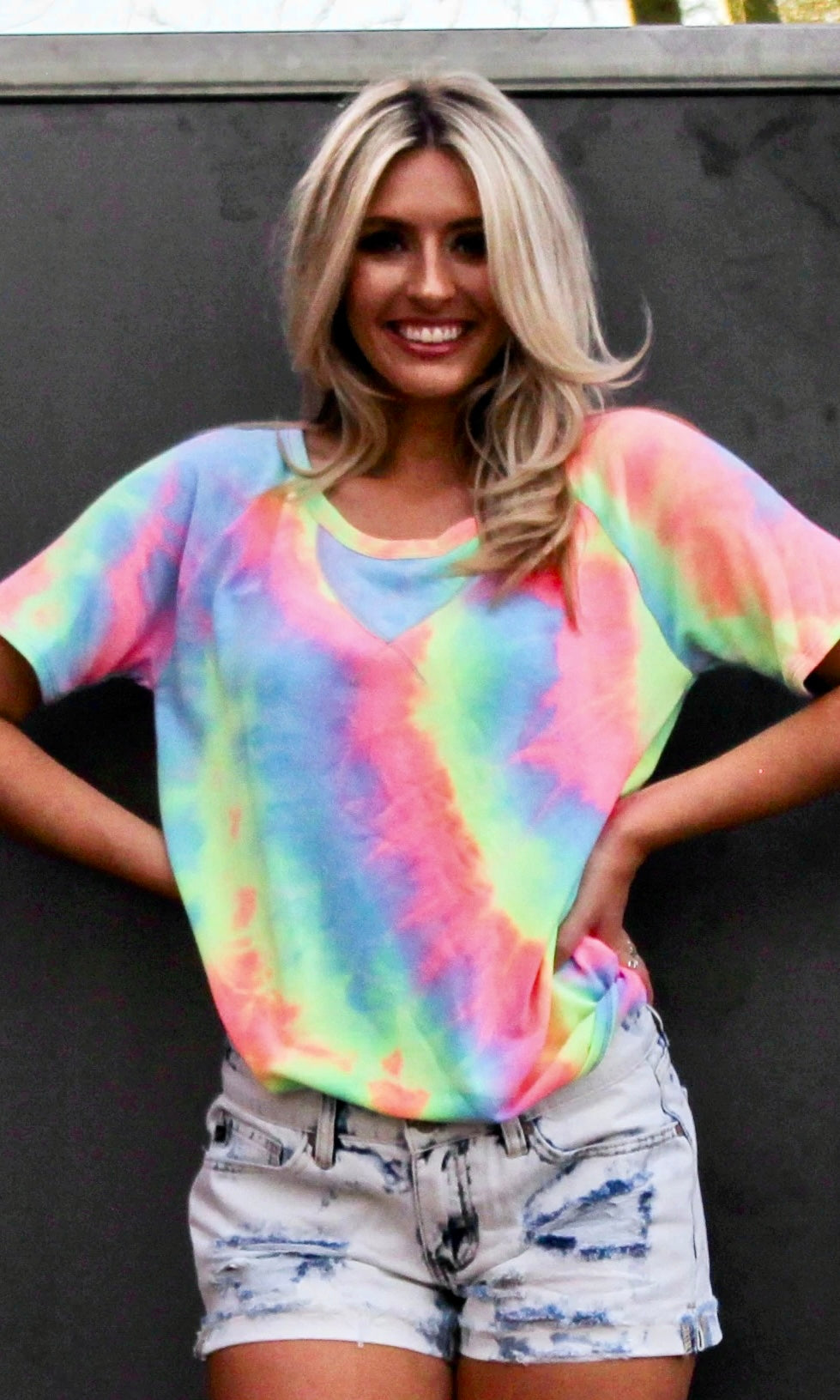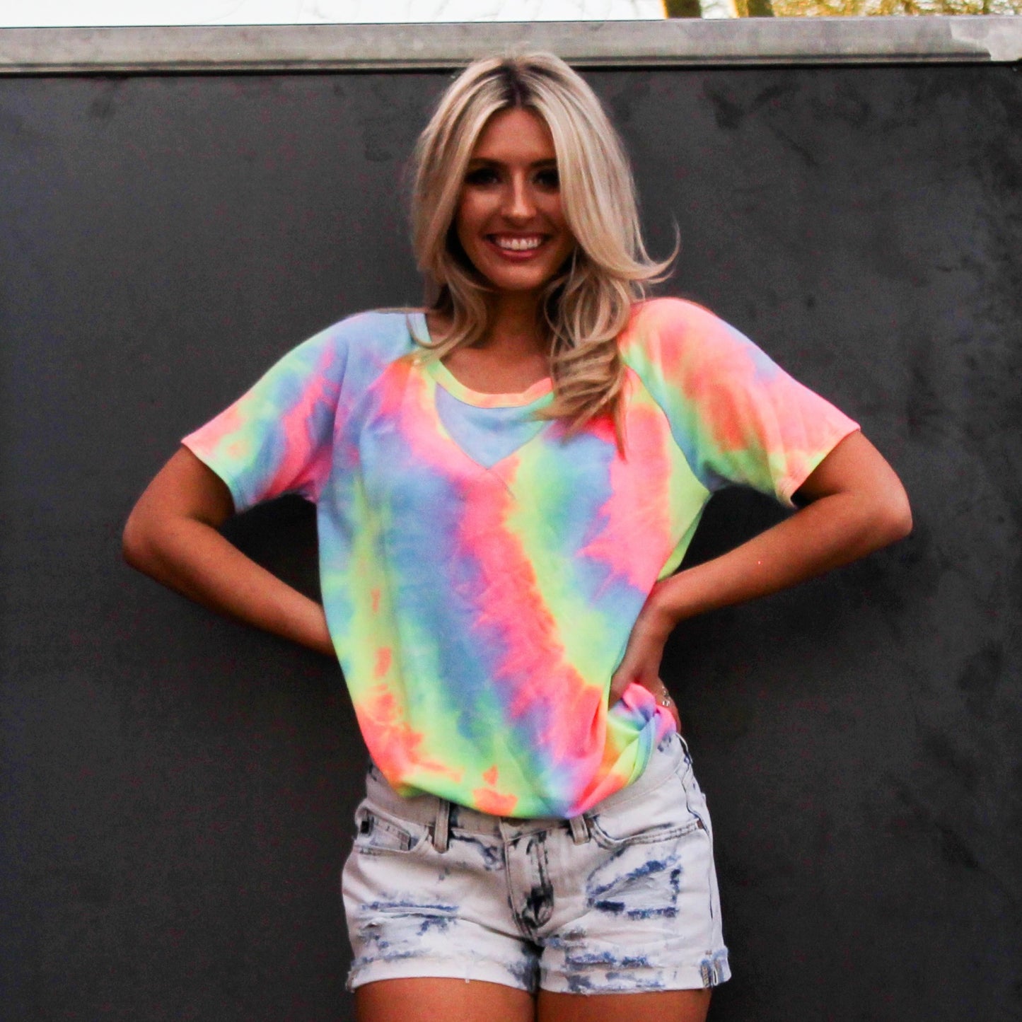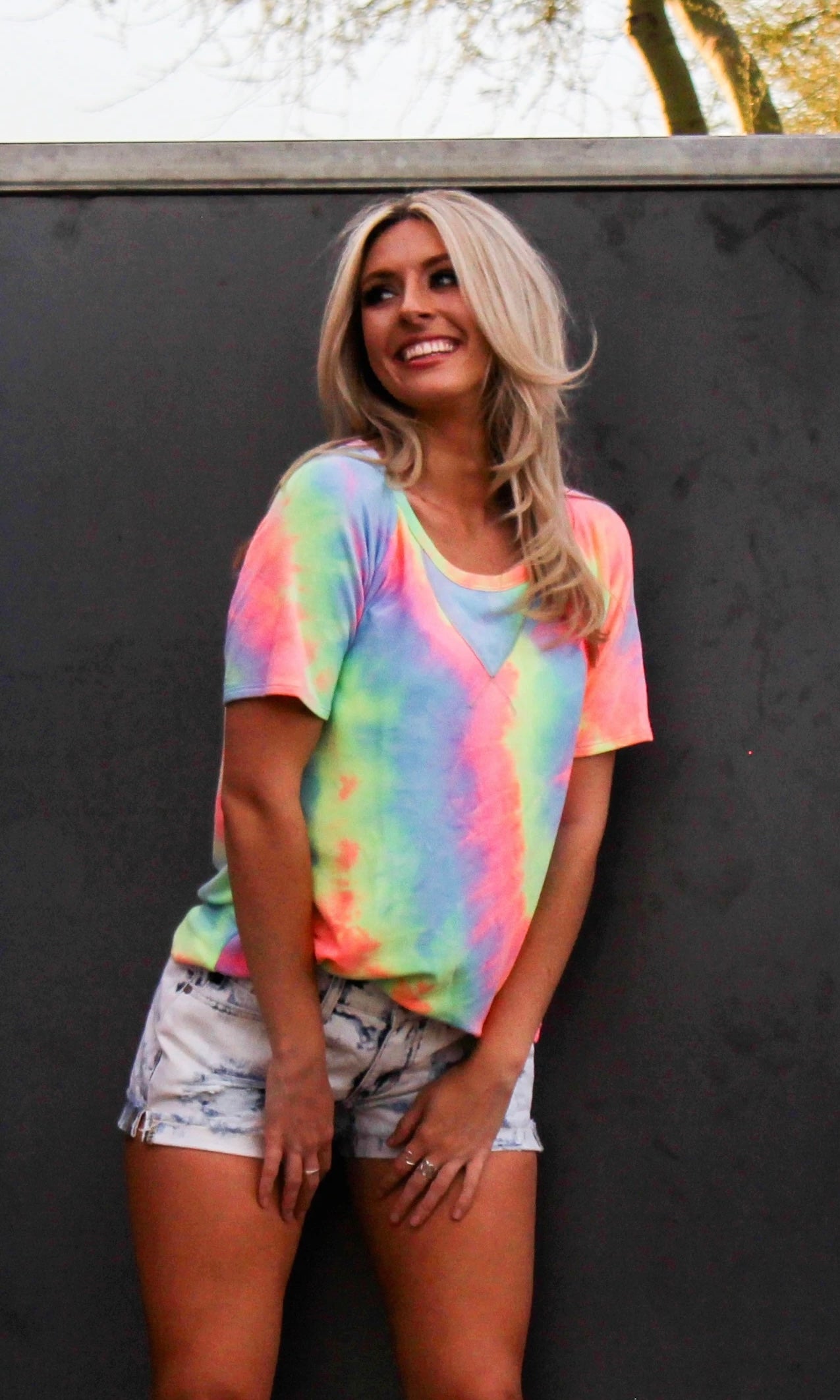 You’ll be sure to stand out in our neon tie dye tee. It features incredibly bright colors and super soft fabric.