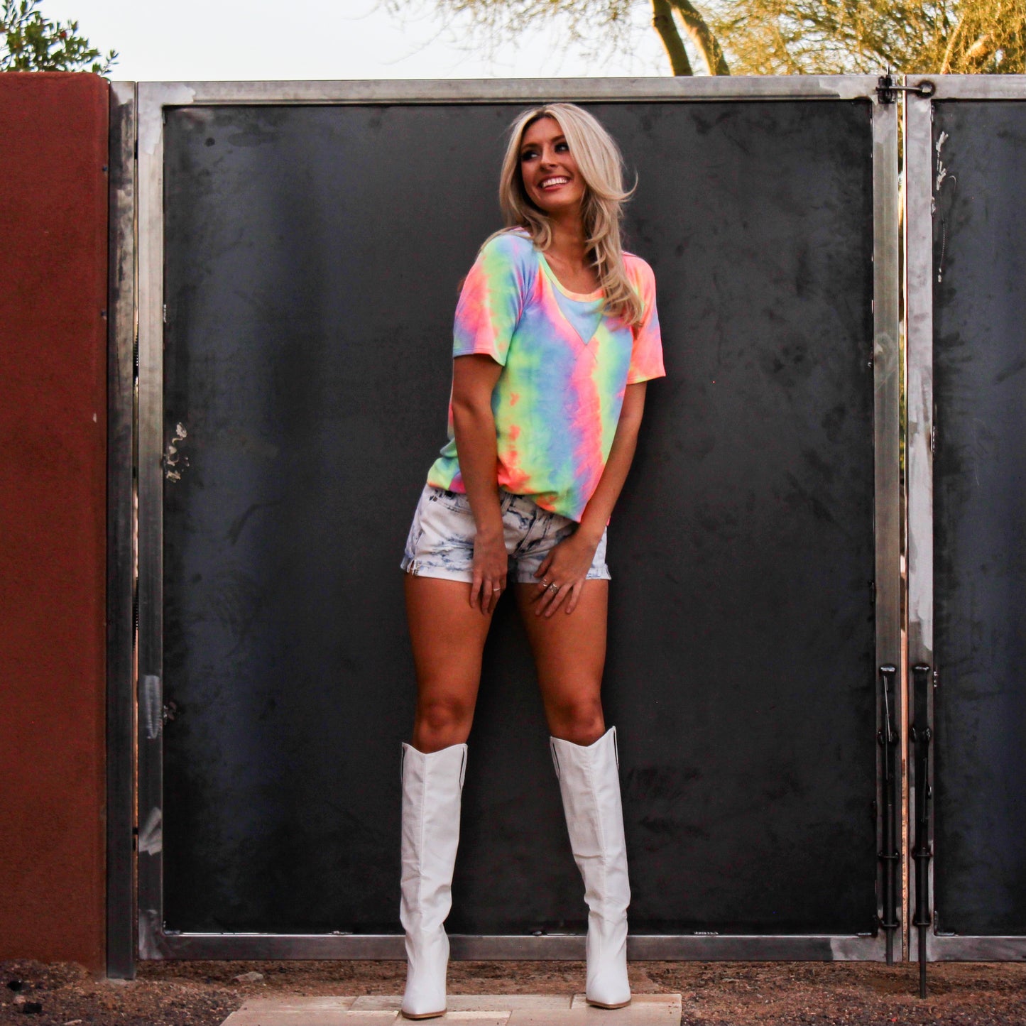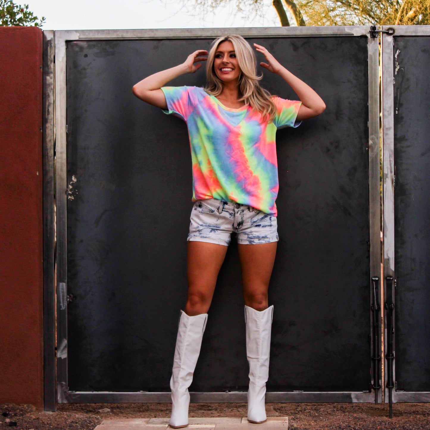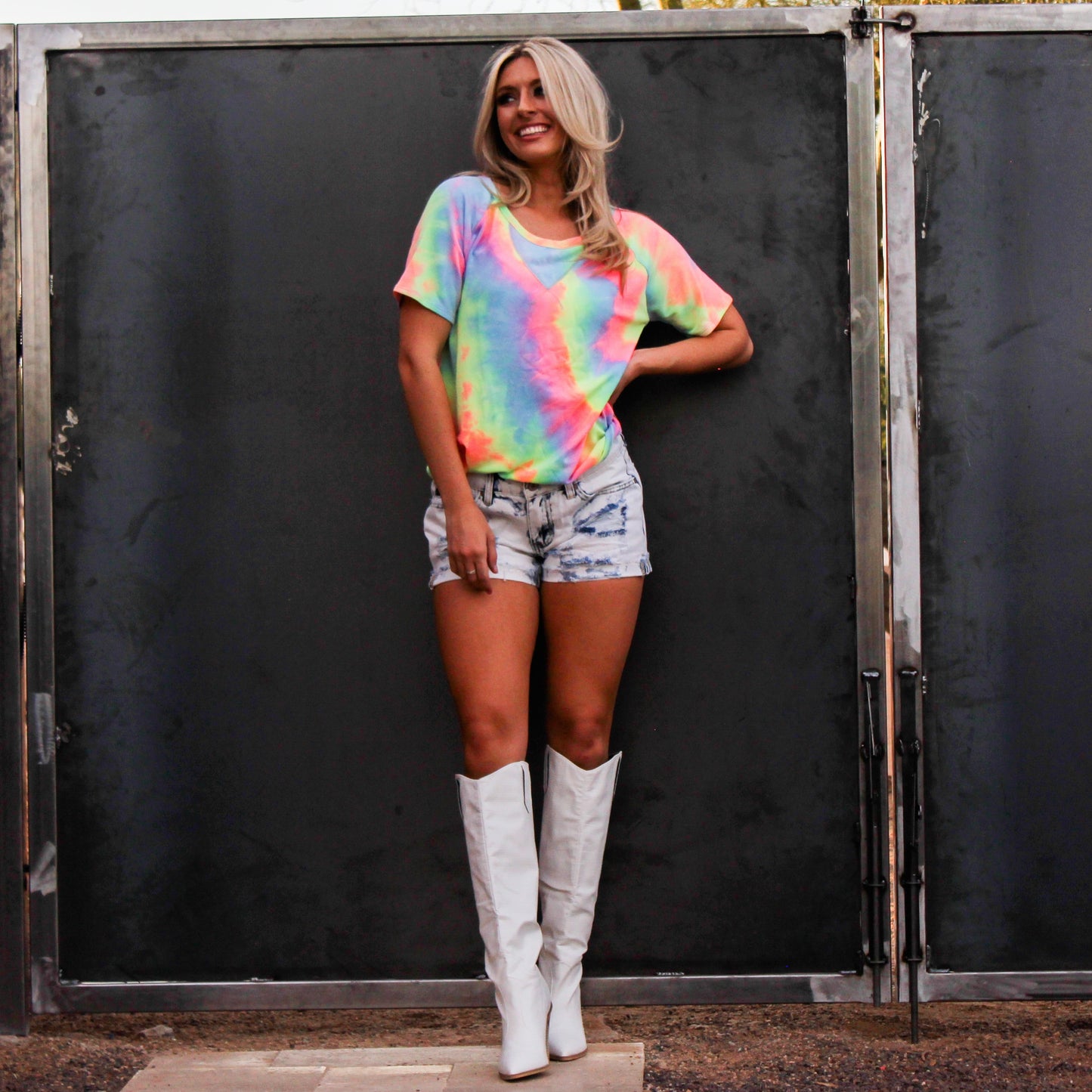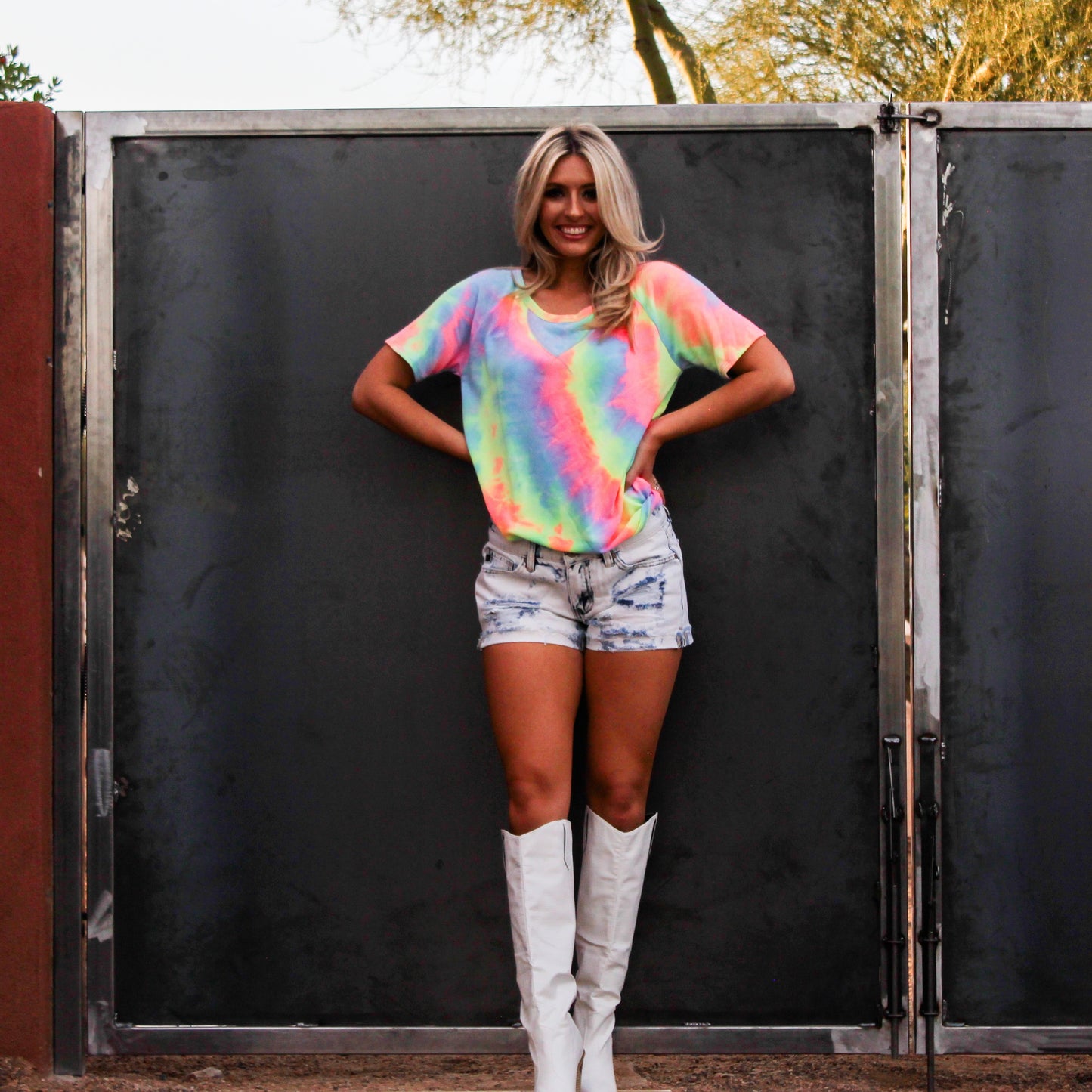 You’ll be sure to stand out in our neon tie dye tee. It features incredibly bright colors and super soft fabric.
