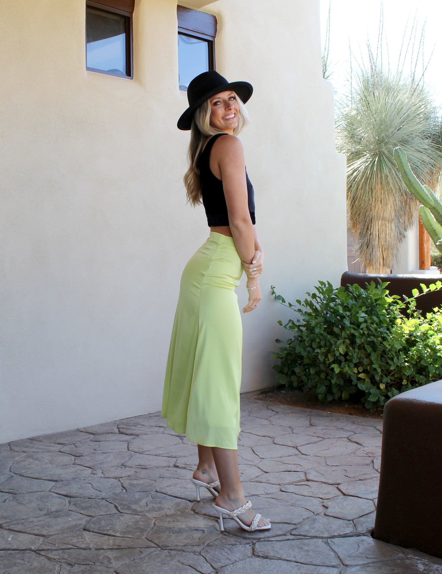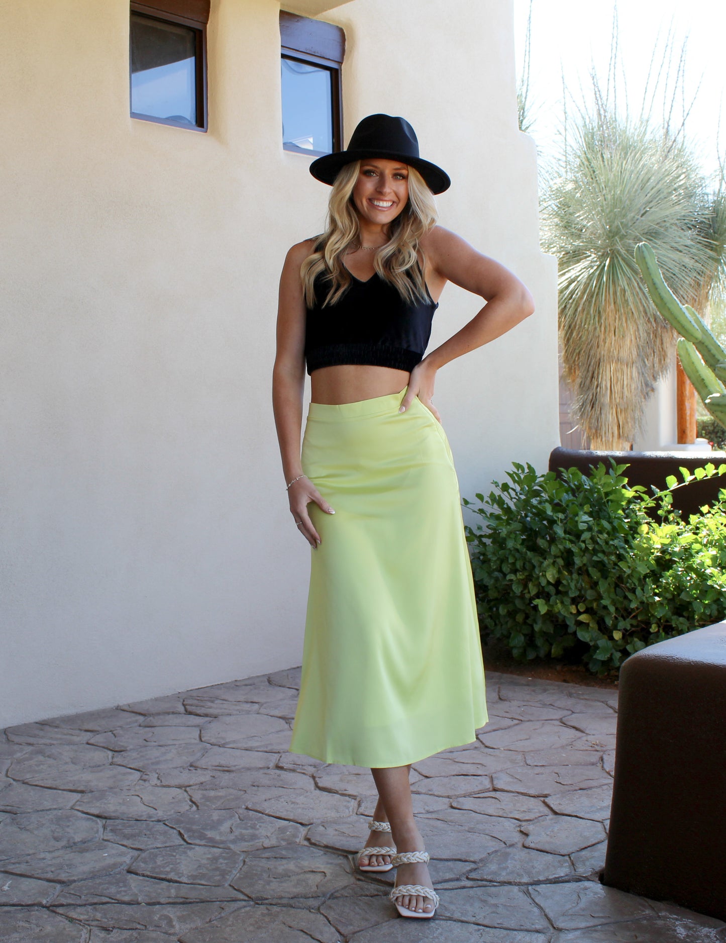 SATIN MIDI SKIRT WITH SIDE INVISIBLE ZIPPER SELF : 97% POLYESTER / 3% SPANDEX LINING : 100% POLYESTER IMPORTED. DESIGNED BY USA MODEL IS 5' 10" TALL, 32" CHEST, 24" WAIST AND 35" HIPS AND WEARING A SIZE SMALL
