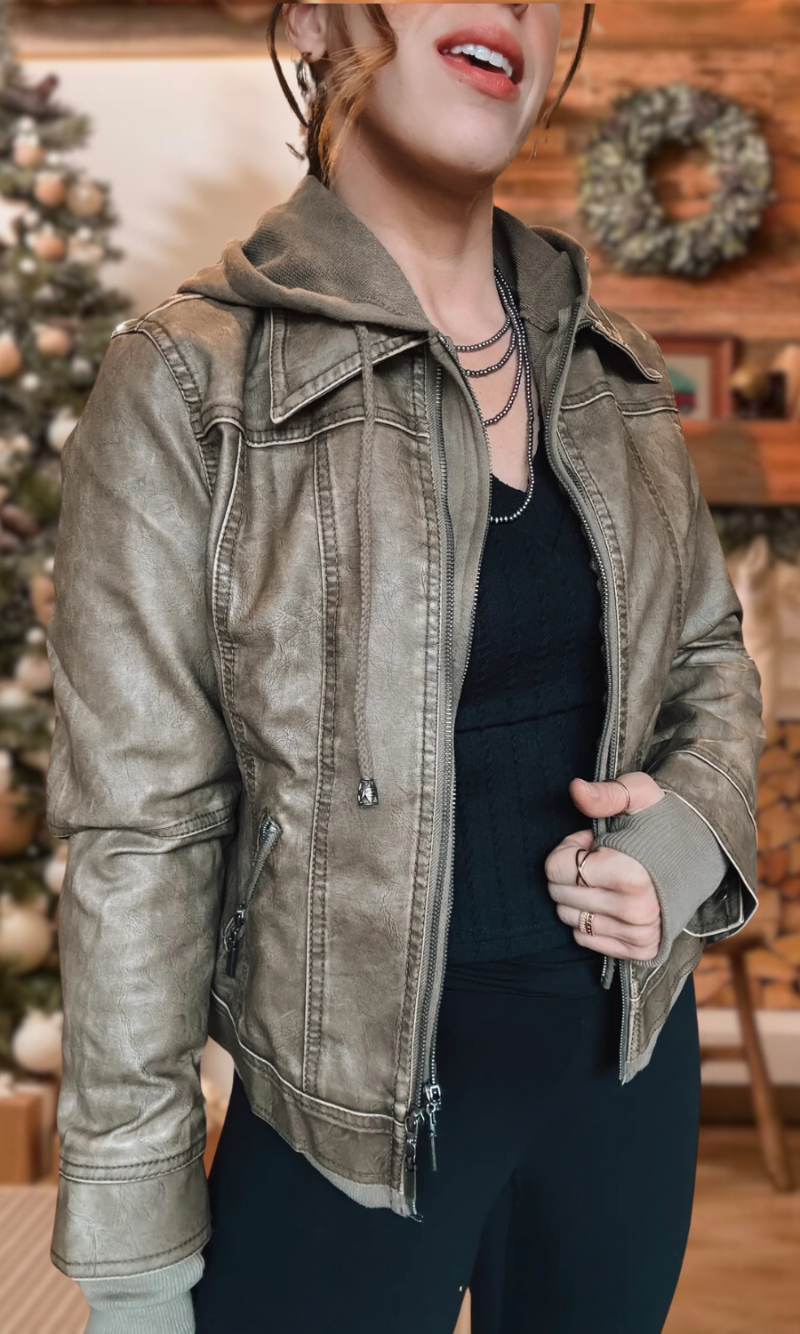 Women's Casual Stand Collar Detachable Hood PU Leather Jacket